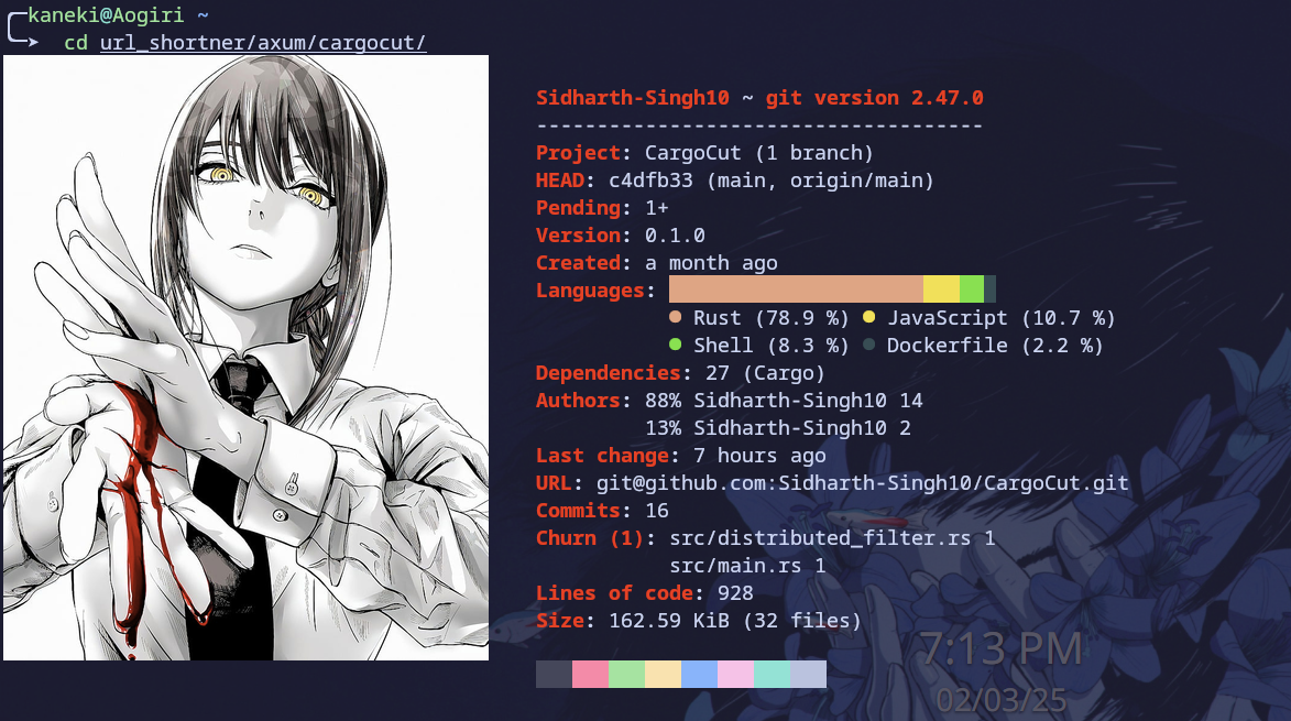 OneFetch transforms your terminal with personalized repository insights. This shell script automatically displays custom graphics alongside comprehensive git stats whenever you navigate between repositories.